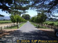 The names of the following places refer to the location names and addresses as known from the show. To learn more about the use of these filming sites in particular episodes of the series and to find out where they are situated in real life, refer to the behind the scenes information in the episode section. Please understand that addresses of private homes used as filming locations cannot be publicized in order to respect the residents' privacy.Views from River Road over the vineyards of Falcon Crest — especially the original 50 acres (the Gioberti Estate) — and its neighbors. The tree-lined main driveway to Falcon Crest is in the center.