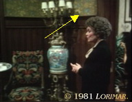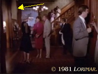 Ungereimtheiten im Bühnenbild des viktorianischen Herrenhauses von Falcon Crest: Die Art und Weise, wie das Treppenhaus gebaut und üblicherweise vom Erdgeschoss aus zu sehen ist, entspricht im Großen und Ganzen der wirklichen Villa Miravalle von Spring Mountain Vineyards in St. Helena, CA. Die Innenkulisse erweckt den Eindruck, dass das erste Obergeschoss über die zweiläufige Podesttreppe zu erreichen ist. In der Weitwinkelaufnahme vom Wohnzimmer aus ist jedoch eine Wand zu sehen, die im zweiten Teil der Treppe eine Art Abmauerung darstellt (gelbe Markierung) und das erste Obergeschoss eigentlich unzugänglich machen müsste (Näheres dazu unter # 066; dort sieht man diese Wand im Detail vom Treppenpodest aus). Auch ein Holzbalken (rote Markierung) ist zu sehen, der offensichtlich unter der imaginären Geschossdecke des Foyers angebracht ist (das Bühnenbild im Studio hat keine Zimmerdecken), was aus architektonischer Sicht keinen Sinn ergibt. Er ist offenbar Teil der Befestigungsanlagen über der Kulisse im Filmatelier.