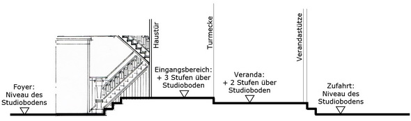 Auch die drei Stufen, die vom Vordereingang ins Foyer hinabführen (grüner Pfeil), existieren in der echten Villa Miravalle nicht (wie auf Standbild 2 zu sehen, welches aus "The Vintage Years" stammt, wofür die Dreharbeiten im echten Haus stattfanden). Der Kulissenbauer fügte sie hinzu, um die Innenräume architektonisch interessanter zu gestalten. Das Ergebnis dieser Idee war jedoch, dass die Veranda dadurch fast wie eine Art Podest leicht erhöht im Vergleich zum Erdgeschoss und der Zufahrt (Studioboden) lag, was auch einen architektonischen Konflikt mit den Fensterbrüstungen und deren Abständen zum Fußboden im Wohn- und Esszimmer auslöste. Vor allem in # 040 (vergleiche dort) wird zu sehen sein, dass im Studio nur zwei Stufen von der Zufahrt zur Veranda hinaufführen und eine dritte einzelne Stufe von der Veranda zum Eingangsbereich existiert. Aus konstruktionstechnischer Sicht ist somit auch nachvollziehbar, dass ins Innere des Hauses drei Stufen von der Haustür aus nach unten führen, denn dadurch bleibt das Erdgeschoss auf demselben Niveau wie die Zufahrt, nämlich dem Boden des Filmateliers. Der nachfolgende schematische Schnitt von Veranda und Foyer der Herrenhaus-Kulisse verdeutlicht dies: