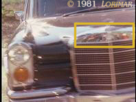 Auf dem Kühlergrill von Angelas schwarzem Mercedes-Benz 600 (Baureihe W100, Modelljahr 1969) spiegelt sich für einen kurzen Augenblick das Filmteam wider.