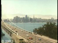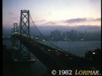 Die Einspielung der Oakland Bay Bridge mit San Francisco im Hintergrund — aufgenommen von der Treasure Island Road (Brücke über Highway 80) auf Yerba Buena Island Richtung Südwesten — ist aus einem Filmarchiv zugekauft.