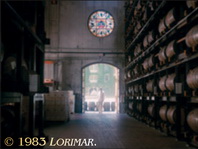 Trotz der Versuche der Beleuchter, durch starke Ausleuchtung das der offenen Tür gegenüberliegende Gebäude — das Inglenook Stone Château, das in # 071 als Küferei zu sehen sein wird — zu verbergen, ist dieses in der Szene noch leicht erkennbar.