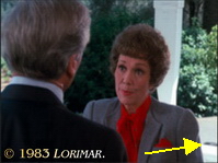 Als Angela auf der Veranda des Herrenhauses von Falcon Crest Phillip sagt, sie sei in Jacquelines Testament erwähnt, ist der Schatten einer nicht identifizierten Person auf dem Asphalt der Zufahrt kurz zu sehen, als diese in Richtung der Kamera geht.