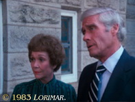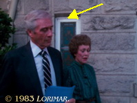 Das Bühnenbild für Ms. Smiths Kanzlei ist die umdekorierte Standard-Schlafzimmer-Kulisse aus dem Herrenhaus von Falcon Crest; Details hierzu unter # 023. Diesmal benutzte die Abteilung für Kunst und Bühnenbild noch einen weiteren Trick, um zu viele Änderungen zu vermeiden: Sie dekorierten nur die zwei Wände um, die man auf Standbild 2 sieht. Coles und Lindas Nahaufnahmen wurden nicht vor der Wand gedreht, vor der sie auf Standbild 2 zu sitzen scheinen. Vielmehr wurden ihre Naheinstellungen vor der Wand gedreht, vor der Ms. Smith auf Bild 2 sitzt. Nachdem die Weitwinkeleinstellungen und Nahaufnahmen von Ms. Smith abgedreht waren, wurde das Mobiliar umarrangiert, und WILLIAM R. MOSES und MARY KATE McGEEHAN tauschten die Plätze mit PAT DELANY. Dies ist für den erfahrenen Zuschauer augenscheinlich, weil die Badezimmertür der üblichen Schlafzimmer-Kulisse des Herrenhauses von Falcon Crest jetzt sichtbar ist (gelber Pfeil auf Standbild 3).