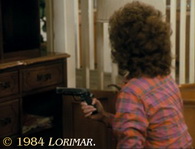 In dieser Folge kann man sehr deutlich sehen, dass die Kulissen zum Teil aus mobilen Wänden bestehen, die je nach Bedarf verschoben oder entfernt werden können. Hier wurden zwei Teile des Bühnenbildes von Josephs Kinderzimmer im Herrenhaus von Falcon Crest nicht ganz korrekt zusammengeschoben (gelbe Markierung).