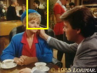 In der Szene zwischen Anna, Cass, Emma, Greg und Angela im Arbeitszimmer des Herrenhauses von Falcon Crest geht Cass um den Sessel, in dem ihre Mutter sitzt, herum und in Richtung von Angelas Schreibtisch, was einen Schatten auf Annas Gesicht verursacht (Pfeile auf Standbild 1); natürlich ist das vollkommen richtig. Eine Nahaufnahme Annas von demselben Augenblick blieb zu diesem Zeitpunkt unverwendet, wurde aber von der Nachproduktion später im Verlauf der Szene eingesetzt: Unmittelbar nachdem Cass sagt, sie werde Angela so leiden lassen, wie Anna, Damon und sie selbst gelitten hätten, stammt die Einstellung von Annas Reaktion (Standbilder 2 und 3) eigentlich von dem früheren Moment. Man kann dies daran erkennen, dass der Schatten in gleicher Weise auf die rechte Seite von Annas Gesicht und Hals fällt (was eigentlich durch Cass' Bewegung um sie herum verursacht wurde).