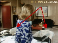 In dieser Folge kann man sehr deutlich sehen, dass die Kulissen zum Teil aus mobilen Wänden bestehen, die je nach Bedarf verschoben oder entfernt werden können. Hier wurden zwei Teile des Bühnenbildes des Arbeitszimmers des Herrenhauses von Falcon Crest nicht ganz korrekt zusammengeschoben (gelbe Markierung).