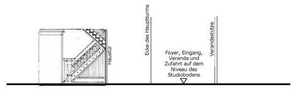 Der nachfolgende schematische Schnitt von Veranda und Foyer der aktuellen Herrenhaus-Kulisse verdeutlicht die derzeitige architektonische Situation: