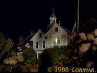 Die Villa brannte 1988 nieder, doch ihre Geschichte als Drehort setzte sich sogar danach fort: Der Schutt war der perfekte Schauplatz für "Falcon Crest", da einige architektonische Elemente an das viktorianische Herrenhaus erinnern, so z.B. die halbkreisförmigen Fenster, die man für das Treppenhausfenster im Hauptturm halten kann, oder das Geländer um die Veranda. Im ersten der obigen Standbilder mit DAVID SELBY und JANE WYMAN sind das Terrassengeländer und eine hohe Mittelmeer-Zypresse zu sehen — diese Einstellung zeigt, dass dieses Segment durch die Trümmer des Hauses hindurch in südliche Richtung gefilmt wurde; es handelt sich um denselben hohen Baum, der auf dem Standbild aus "Hart to Hart" links zu sehen ist.