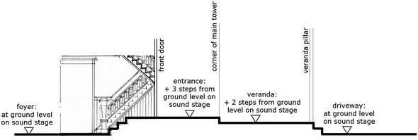 Also, the three steps leading from the front entrance down into the foyer (green arrow) do not exist in the real Villa Miravalle (as visible on screen grab 2 from "The Vintage Yerars", which was filmed inside the real house). The set designer added them to make the interiors architecturally more interesting. The result of this idea, however, is that the veranda would be almost like a slightly elevated platform or landing compared to the first floor and the drivewy (sound stage floor), which would also create an architectural conflict with the window sills and apron walls in the living and dining rooms. In particular # 040 (compare there) will reveal that the set has only two steps from the driveway up to the veranda plus a third step from the veranda to the front door. Construction-wise, the three interior steps from the entrance down into the foyer were mandatory to have the first floor on the same level as the driveway, i.e. the floor of the sound stage. The following sectional elevation drawing of the Victorian Mansion's set (veranda and foyer) illustrates the architectural levels: