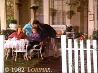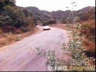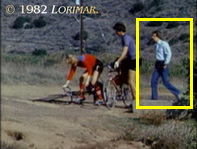In the more dangerous far shots of Angela's and Lance's speedy driving through the valley (both to Elizabeth's house and back), JANE WYMAN and LORENZO LAMAS are replaced by stunt doubles PATTY ELDER and CHRISTOPHER DOYLE respectively.