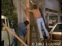 Inside joke: The Gioberti Estate garage introduced in this episode — better visible in # 015 (second screen capture) — is an exterior set previously built for EARL HAMNER's old show, "The Waltons", on THE BURBANK STUDIOS (WARNER BROS.) backlot: the barn next to the Walton House. In 1991, the complete Walton set burnt down in an electrical fire. It was rebuilt for the later reunions of "The Waltons" at the nearby WARNER BROS. RANCH.