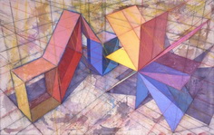 The art print in Richard's New Globe office near the door is a reproduction of "Bent Vents and Octangular" (acrylic on canvas; 1976) by American painter RON DAVIS (1937 – 2025). The original painting is on exhibit in The Museum of Contemporary Art in Los Angeles.