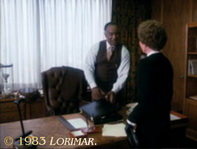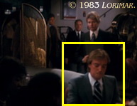 Cutting costs: DAVID SELBY, as Richard, wears wardrobe from "Flamingo Road" again in this episode — this time, the exact same outfit (a dark blue V-neck sweater, a white shirt and gray slacks) that he wore as Michael Tyrone / Edwards in # 30 of "Flamingo Road" (1981-82 season; screen capture 1).