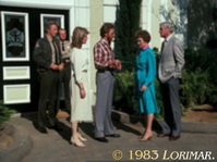 The interior set of Cole and Linda's bedroom in the Gioberti Estate Guest House is the same as the set of Joseph's bedroom (e.g. featured in # 028 — compare screen capture) in the Falcon Crest Victorian Mansion. Joseph's nursery is also the same set as the usual Falcon Crest Victorian Mansion bedroom set; compare # 021 and 028 for more details on the nursery as well as # 001 (guest bedroom in the Victorian Mansion) and # 023 (Lance and Melissa's bedroom) — an easy way to cut down production costs. Only minor changes are made and different furniture is brought in to make the same set look like various rooms.