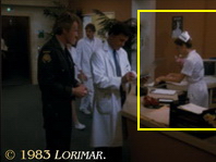 Uncredited stand-in MARTHA MANOR appears as an extra again — as a Tuscany Valley Hospital nurse, in a curly brunette wig again. For another appearance in this episode, see below.