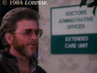 After his first appearance in this episode (see above), uncredited extra ERNIE TATE participates again as the mustached Tuscany Valley doctor with graying hair — this time on the Tuscany Valley Hospital parking lot (his most prominent appearance in this episode). For further appearances see below.