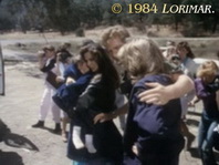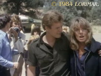 The establishing shot of the wreckage of the plane on the crash site is stock footage that originated on "Dallas". In the "Dallas" episode "Survival" (# 014 <1.09 — original count> / <2.09 — DVD count>), the same shot was used to establish the site of J.R. and Bobby's plane crash, just in broad daylight (right screen capture). For "Falcon Crest", the day shot was filtered in post-production, similar to creating a "day for night" (details see below). The Southfork logo on the plane from the "Dallas" episode is still visible on "Falcon Crest" in the upper right corner of the frame (yellow mark on the left screen grab).