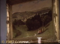 As this episode reveals, there has been a new picture on the wall above the fireplace mantle in the Falcon Crest Victorian Mansion study since the beginning of this season; it will be hanging there through # 171. A close-up (screen grab 2) will be featured in # 165. It is a Realism painting (oil on canvas; ca. 1882) by German artist HANS THOMA (1839 – 1924) entitled "Offenes Tal" ("Open Valley").
