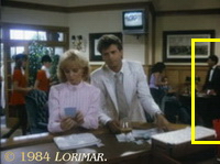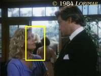 Uncredited extra DOTTY ERTEL appears as the blonde Tuscany Valley socialite again — this time at the Tuscany Downs Turf Club again. She is hardly recognizable from behind outside on the balcony. By the way, the background actors and actresses in this scene are all the same as in the last Turf Club scene in the preceding episode, and all the extras are wearing the same clothes. The "secret" is that both scenes were filmed on the same shooting day; the scenes, however, are supposed to depict two different days in the show's timeline.