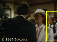 Uncredited extra ERNIE TATE appears in this episode again, but not in his usual rôle as the mustached Tuscany Valley doctor with graying hair. As a Tuscany Downs Turf Club patron this time, he has no mustache, and his hair is dyed black. He will be visible more closely in a later scene at the Turf Club again (see below).