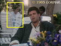 The chair in the background (red arrow) is inscribed "RUSS NORDSTEDT", which is the name of the actual key grip in the "Falcon Crest" camera department. Shortly after, RUSS himself is visible in the scene (red mark on screen grab 2).
