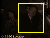 Uncredited extra WALTER M. SPEAR appears as the bald and bearded Tuscany Valley gentleman again — this time at the fundraiser for J.J. Roberts' campaign at Falcon Crest, again alongside the lady played by KATHRYN JANSSEN, his real-life partner (see above).