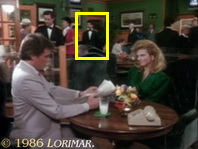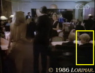 Uncredited extra TONI SCHABER appears as the curly haired platinum blonde again — this time at the Art Déco style restaurant where Maggie and Chase as well as Terry and Richard are dining.