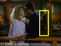 Uncredited extra IAN BRUCE participates again as the chestnut-haired guy with a receding hairline — this time as a patron at the hotel restaurant in New York where Maggie and Jeff are having dinner. It seems like an unusual conincidence that this Tuscany Valley inhabitant is there just at the time when Maggie is on her promotional tour for her novel. Maybe a case of negligent extras casting?