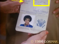 Prop mistake: When the camera features a close-up of Angela's passport in this episode's cliffhanger, parts of her alleged date of birth are legible on the left (yellow arrow): "... 19, 1921". This is an apparent inconsistency caused by negligence of the prop department. 1921 is way too late for Angela's year of birth. It was established (especially in seasons 1 and 4) that Angela was Jasper's oldest child. In particular, the old black and white photo Cole got from his Italian relatives and handed to Angela in # 008 showed a striking age difference between Angela and Jason of at least five to six years. The old photo of Jason and Chase at the Gioberti Estate seen in # 003 was taken by Jacqueline on July 11, 1950, shortly before Jacqueline left the valley for Europe and took Chase with her. It could also be derived from the information in # 012 about Chase joining the Air Force Academy in 1958 and from his getting married with Maggie in 1959 (as seasons 3 and 4 implied) that Chase was born in 1939. Had Angela actually been born in 1921, as the date in her passport suggests, Jason's year of birth would have been approximately 1926 or 1927, which would make Chase's birth in 1939 an impossibility. It was also established in # 075 that Angela was trying to rebuild Falcon Crest after Prohibition, which ended in 1933. It seems unrealistic that Angela would have helped Jasper rebuild the wine estate at age 12. For all these reasons, it is pretty obvious that the passport is an inconsistent prop. Although Angela's age was never mentioned explicitly in the course of the series, the show always implied that Angela was born in 1914 — the year when JANE WYMAN was allegedly born (the year at least LORIMAR and the writing staff had considered to be correct). Just as a side note, some more information on the mystery about the actress' real age is available in the In Memoriam... – Cast – Obituaries section.