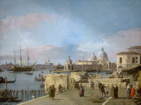 In Paolo Bellini's house, the painting "Entrance to the Grand Canal from the Molo, Venice" (oil on canvas) by CANALETTO a.k.a. GIOVANNI ANTONIO CANAL (1697 – 1768) is on an easel.