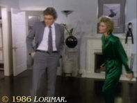 Prop: The black vase on the pedestal in the sitting room of the master bedroom suite in Richard's house seems to be immortal. Shortly before Richard and Terry shared their first moment of passion in # 118, she smashed that black vase (screen captures 1 and 2), a $ 1,500 piece, as Richard stated. In the current episode, the same type of vase is now back on the pedestal again (screen grab 3). Terry probably bought it as a replacement — while it was a cheap mass-produced product in real life, and LORIMAR apparently had more than one of these vases in their prop department.