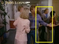 DAVID GUST, the tall, black-haired and mustached uncredited extra, who is best known for his rôle as an assistant district attorney (# 091, 092 and 154), but who also plays different characters in the series, helps clean up the mess in the Falcon Crest Winery Building this episode. Not a wise decision to choose this extra because of his usual appearances as a Tuscany County A.D.A.