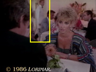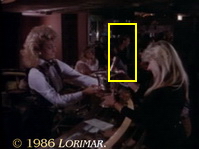After his two earlier appearances in this episode (see above), uncredited extra GARY GELLER appears again — now as the blond, short-haired and mustached socialite, this time as a patron at the nightclub at the River Oaks Spa.