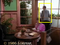Despite LORIMAR's "new wardrobe for new season" policy, this episode, Angela wears the green / pink / white silk outfit by DAVID HAYES she already wore in season 5 (compare # 113).