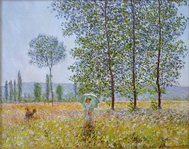 Above the fireplace in the Falcon Crest Victorian Mansion living room hangs "Femme à l'ombrelle" ("Woman with a Parasol (facing right)") now until # 140. It is an 1886 Impressionist style painting (oil on canvas) by CLAUDE MONET (1840 – 1926). To match the format for the wall above the mantle, the upper and lower parts of the picture seem to have been cropped, which seems quite odd. The actual MONET artwork, by the way, is one of several similar pictures — there is another one with the woman (actually MONET's wife) facing left and the most popular one that also includes the artist's little son.