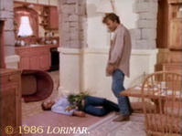 Of course, the scene with EDWARD ALBERT throwing the chair through the window was filmed without SUSAN SULLIVAN and ROBERT FOXWORTH in order not to harm the talent. When the camera is on them, only the sound effects and some parts of breakaway glass were used to create the illusion of the window breaking and the chair being thrown across the room.
