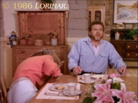 The rooms in the Falcon Crest Guest House have changed: During an argument with Cass in # 103, Anna climbed up a few stairs to a door leading to the center part of the cabin where the bedroom(s) is / are located. Now that Dan resides here, the stairs are gone, and the living room looks completely different. Also check # 146.