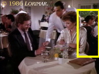 Uncredited extra SHARRI ZAK appears as the gray-haired Tuscany Valley socialite with the pony tail again (yellow arrow); this episode in her day job outfit as a nurse (compare # 053) again, heading towards her gray car Cadillac Seville in the foreground.