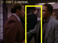 Uncredited extra DAVID CHANNELL appears again as the brown-haired Tuscany Valley gentleman — this time in the Del Oro lobby. For another appearance of this background actor in this episode, see below.