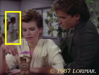 Uncredited extra SHERRY HUEFFMEIER appears as the young brunette with long hair again — this time as a waitress at the Coit Café.
