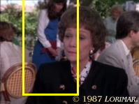 DAVID GUST, the tall, black-haired and mustached uncredited extra, who is best known for his rôle as an assistant district attorney (# 091, 092 and 154), but who also plays different characters in the series, appears on the terrace of the Coit Café this episode (yellow mark on the above screen capture).
