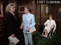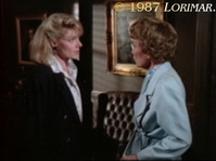 Early script drafts contained a scene at the beginning of act 2 in which Maggie calls Richard during his "house arrest" at Travis' place from Angela's study at Falcon Crest. She realizes Travis wants to kill Richard. — This scene was rewritten: In the final version, Maggie grabs at Angela's phone to call Garth so he can help locate Lillian.