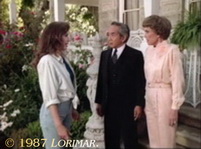 Season time frame: Three months after Chase's death. — As he disappeared in April, it must be July 1987 now. Giving respect to the fact that # 162 depicted the events around the beginning of May 1987, quite some time must have gone by. As # 163 depicts four days only (Travis chasing Richard in particular) and the subsequent # 164 depicts just two more days (Nurse Claudia's attempt to kill Lance in particular), there seems to be only one logical conclusion: Approximately six weeks must have gone by between the two final scenes in # 164 — Angela and Chao-Li in the Falcon Crest Victorian Mansion study; Liz entering Richard's New Globe office.