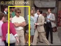 Uncredited extra LEDGE MUSSELMAN appears in this episode as the dark blond mustached guy again — this time not at his place of work at the Del Oro, but on a street in North Beach in San Francisco.