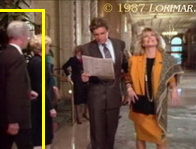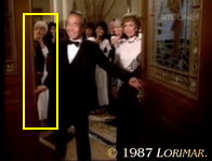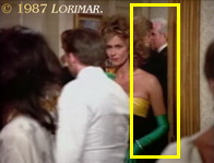 DAVID GUST, the tall, black-haired and mustached uncredited extra, who is best known for his rôle as an assistant district attorney (# 091, 092 and 154), but who also plays different characters in the series, appears for a second time in this episode — at Maggie and Richard's engagement soirée. Compare above for his first appearance in this episode.