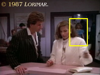 It is her final appearance on the show. As far as her primary rôle — the brunette in her 20's — is concerned, she apparently worked among the editorial staff of The (New) San Francisco Globe first (# 020), but changed her day job later, working as a nurse at the Tuscany Valley Hospital / Queen of the Valley Hospital (# 041). She also volunteered as a county official at the Board of Supervisors meetings at the Tuscany County Building (# 021 and 025). The extra appeared in her primary rôle in many previous episodes (compare # 020, 021, 024, 025, 029, 030, 033, 038, 041, 042, 043, 044, 048, 052, 065, 066, 071, 084, 085, 088, 090, 104, 106, 110, 112, 130, 154 and 167). In addition, the background actress played a maid at the Falcon Crest Victorian Mansion twice (# 066 and 112).