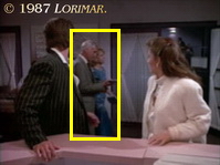 Uncredited extra BUZZ BARBEE appears in this episode again in his usual rôle as a white-haired Tuscany Valley doctor — this time in the New Globe foyer. For another appearance in this episode, see below.