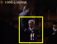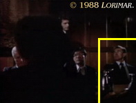 DAVID GUST, the tall, black-haired and mustached uncredited extra, who is best known for his rôle as an assistant district attorney (# 091, 092 and 154), but who also plays different characters in the series, is one of the last guests to leave the Falcon Crest Victorian Mansion after Richard and Maggie's engagement party. See below for two more appearances of DAVID GUST in a different part in this episode.