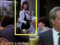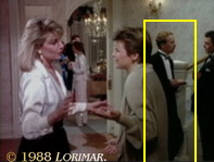 Uncredited extra PAUL VAN appears in his usual rôle as the mustached Tuscany Valley doctor again — this time at Angela's fundraising party for the QVH's Frank Agretti Cancer Unit. He escorts the gray-haired socialite, his colleague from the hospital (SHARRI ZAK, see above).